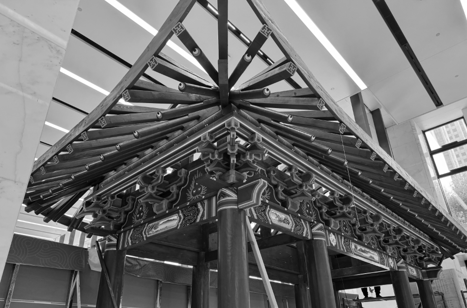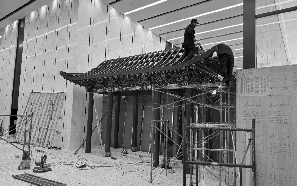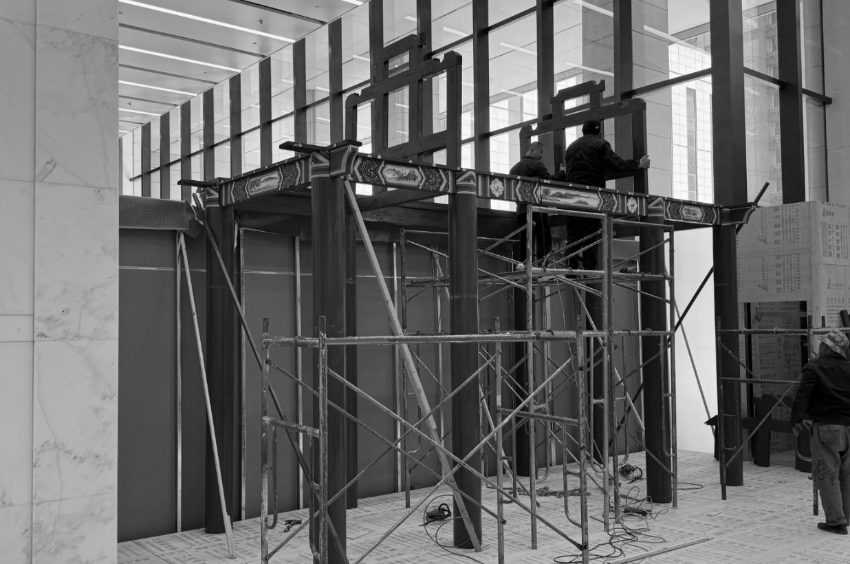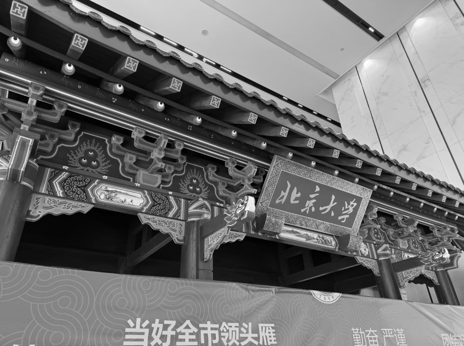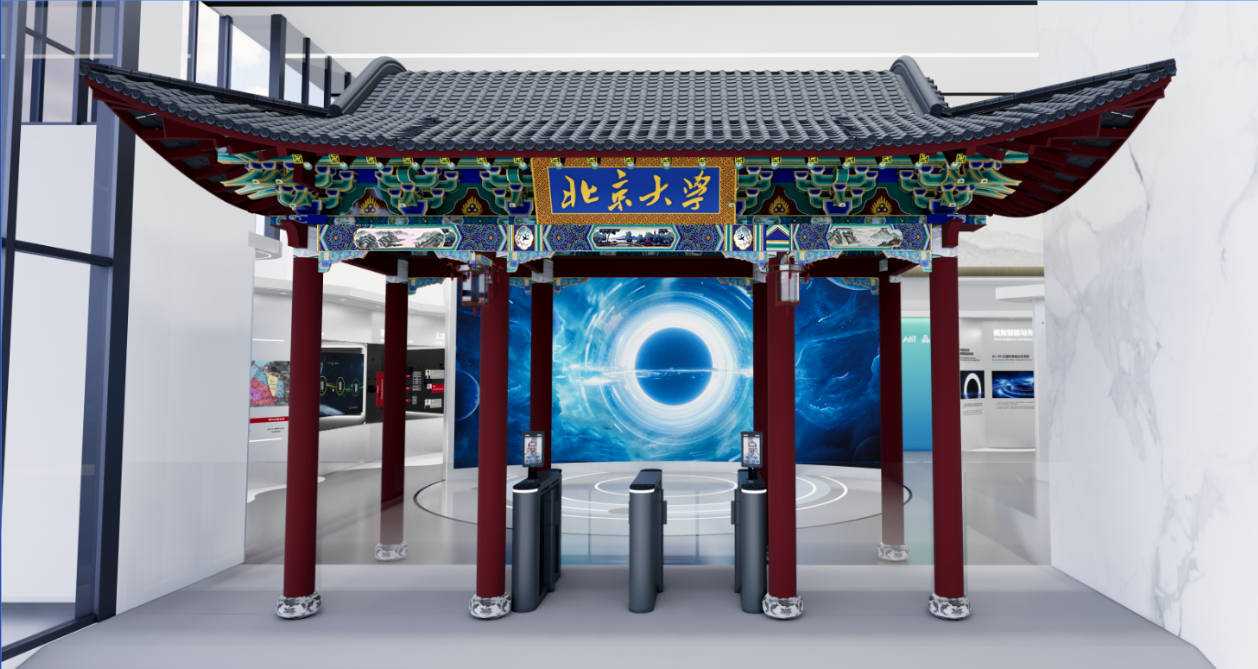 乐牛奶专业古建团队设计施工,高度还原北京大学西校门,致敬经典,寓意观者从此进入北大信研院展厅,打开技术研发和创新探索的大门。