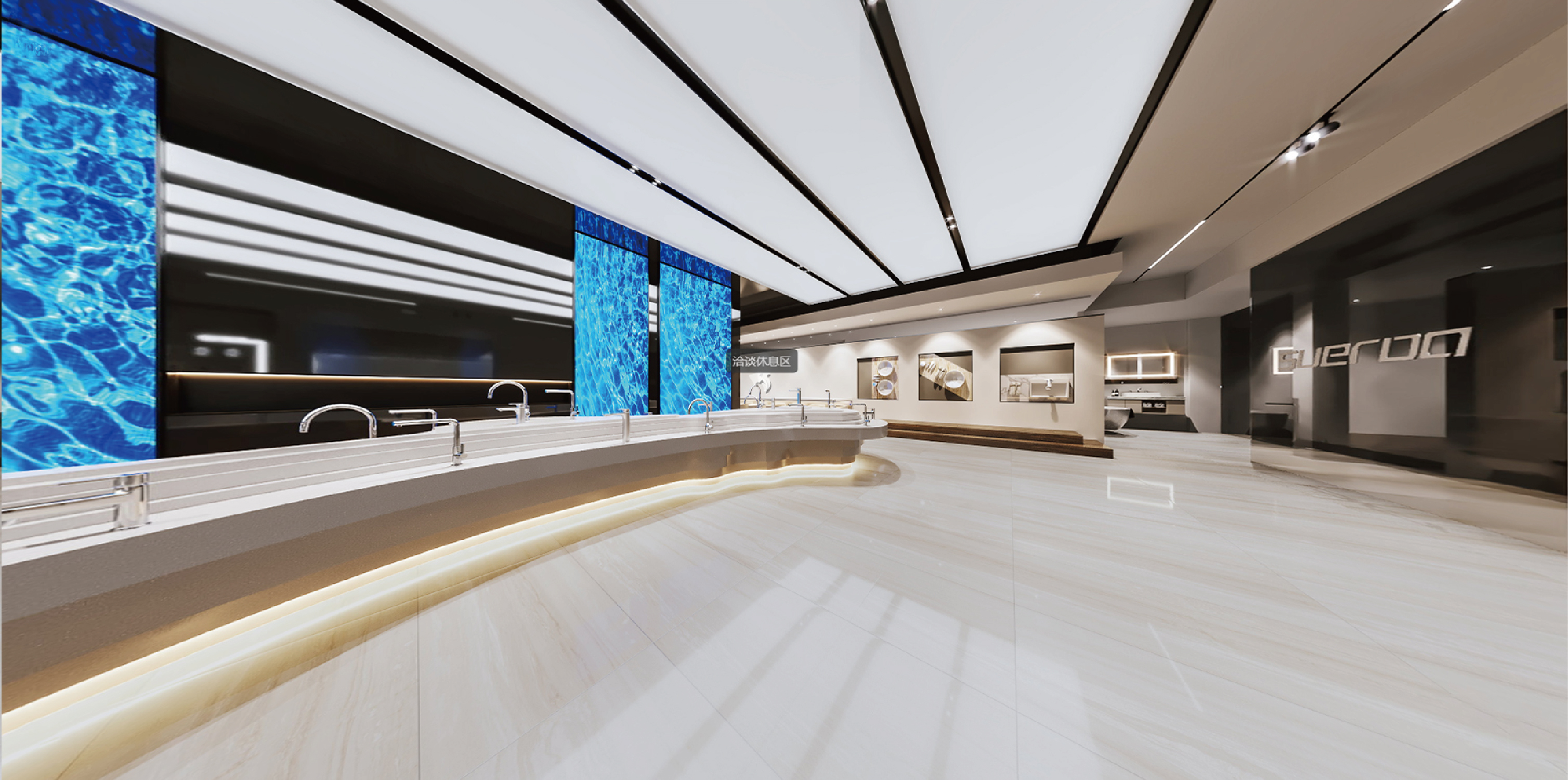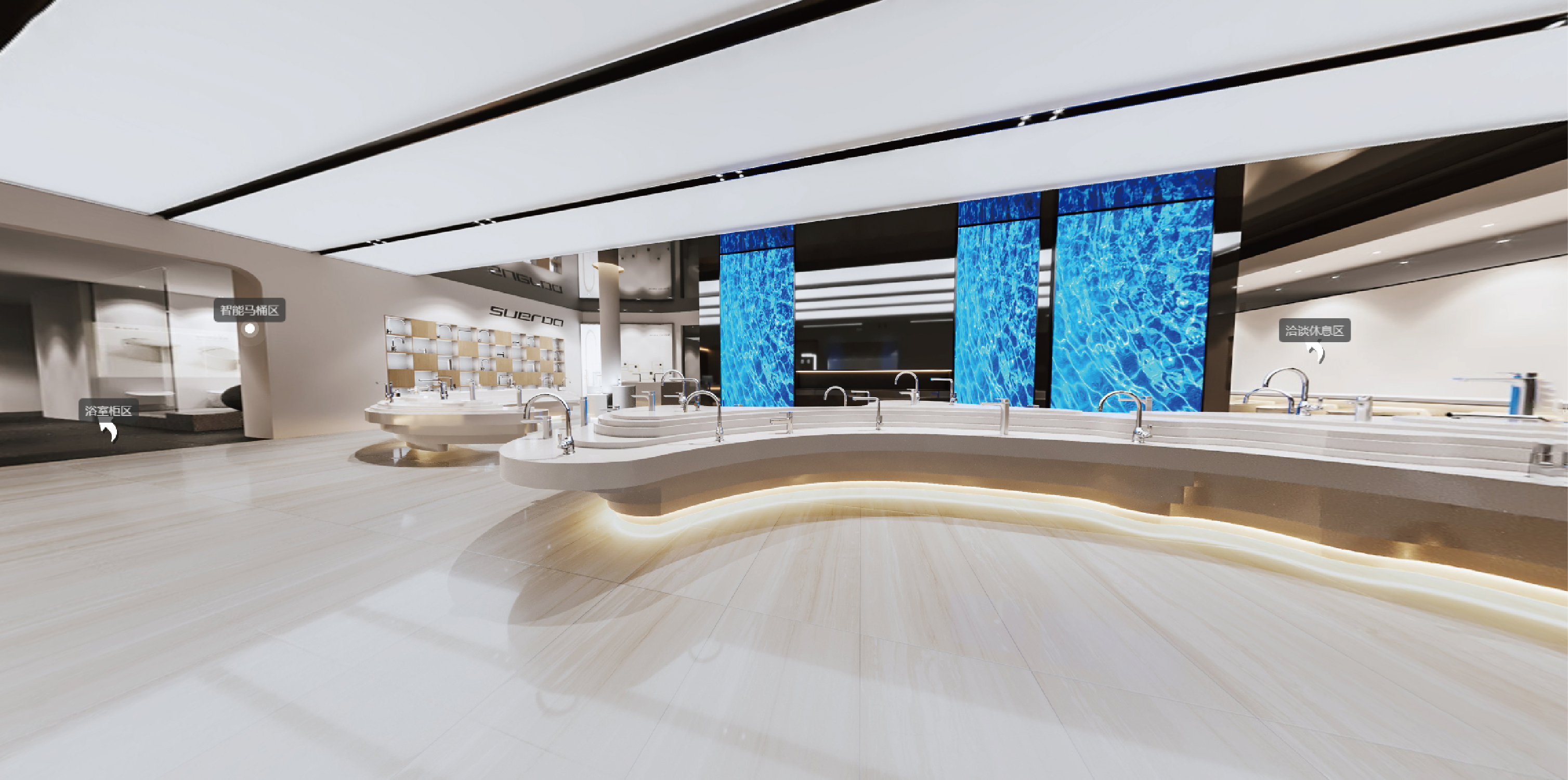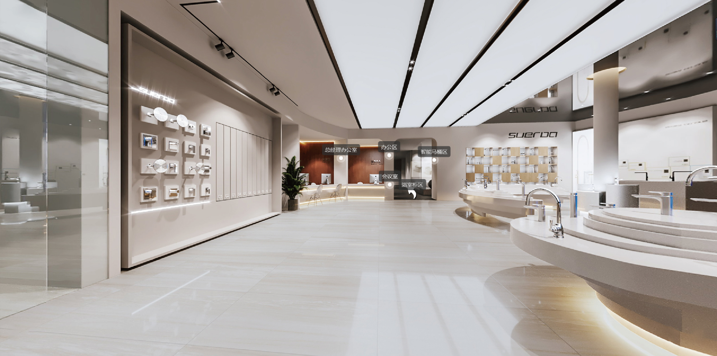 后面三面以水元素为主题的灯箱,体现了苏尔达的品牌文化,也是整个正厅的点睛之笔。