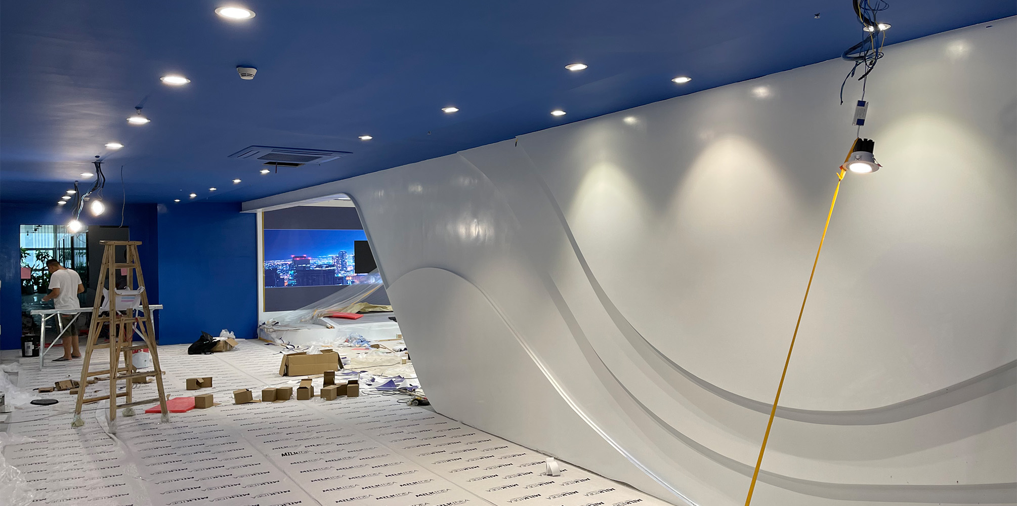 左侧墙面可以看到简洁大气的文字造型,背发光的设计,使得墙面看起来更有层次感,