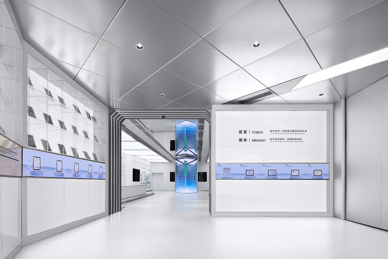 面对新能源企业展厅项目,我们以 “极简科技风” 构建空间骨骼。大面积纯净白色铺满地面与墙面,如同为科技成果铺就无界画布,消解空间边界,营造通透、开阔的视觉体验。顶面线条与地面肌理相互呼应,或笔直延伸,或韵律起伏,悄然引导参观者的视觉动线,让空间自带流畅叙事节奏,于简洁中暗藏秩序,为后续科技元素的融入埋下伏笔。