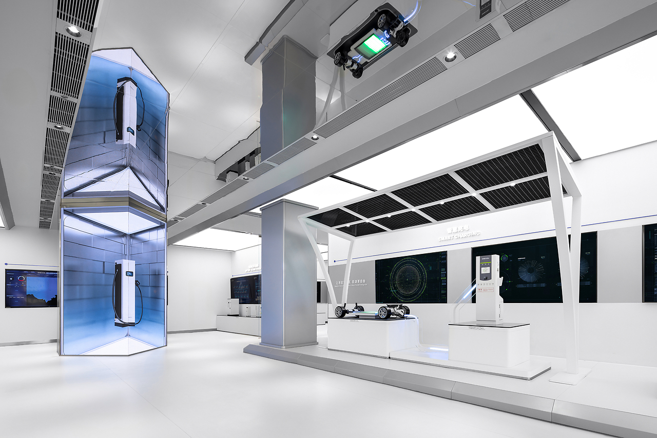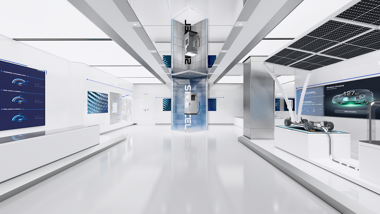 数字化展陈是科技展厅的灵魂引擎。墙面上,智能交互屏实时跳动着能源数据曲线、技术原理 3D 动画,把晦涩的科研成果转化为直观易懂的动态语言;悬浮于空间的装置艺术,搭配动态光影,将新能源设备的创新点拆解、重构,以立体化形态 “悬浮” 于参观者眼前。我们让技术不再是冰冷的参数,而是可触摸、可沉浸体验的空间符号,真正实现 “科技为人所感知” 。