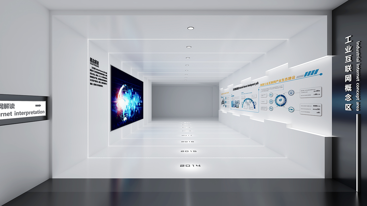 我们以 “工业互联网概念区” 为线索,打造时间轴沉浸式通道。墙面层叠的白色框架,如同数字世界的 “记忆档案柜”,年份标识沿着地面延伸,引导参观者回溯产业发展关键节点。左侧屏幕循环播放技术迭代纪录片,右侧展板用信息图表拆解概念演进,从模糊到清晰,从理论到实践,让 “工业互联网” 不再是抽象名词,而是可触摸、可追溯的产业进化故事,构建深度认知的基础逻辑。