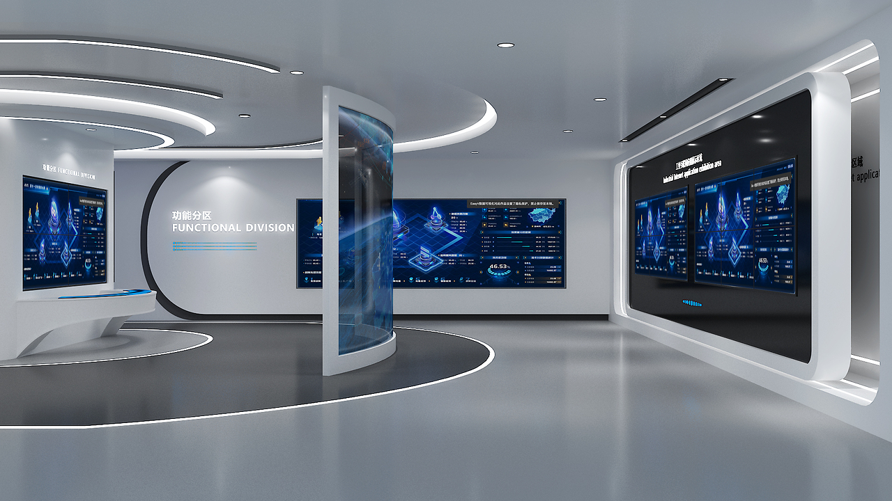 科技展厅的核心,是将抽象技术转化为直观体验。在大数据展示区,弧形屏幕与墙面交互屏联动,实时跳动的产业数据、色彩斑斓的热力地图、动态更新的设备运行曲线,把企业的数字化能力 “翻译” 成可视化语言。圆形装置艺术嵌入数据屏,模拟 “数据中台” 概念,让参观者站在中央,就能直观感受企业对数据的聚合、分析与应用能力,实现 “技术实力可视化” 的体验突破。