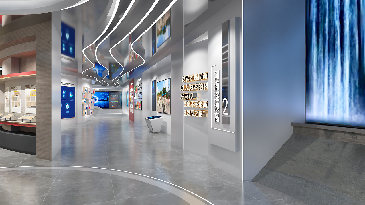 在科技展示区,空间以 “理性与未来感” 重构。弧形展墙化作 “能源数据屏”,实时跳动的发电量、水位监测等数据,搭配智能沙盘,直观呈现水电站的运行逻辑。参观者可通过交互设备,模拟调度水电资源,在 “操作与反馈” 中,解码科技如何让能源管理更智能、更高效,感受当下水电能源的科技张力。